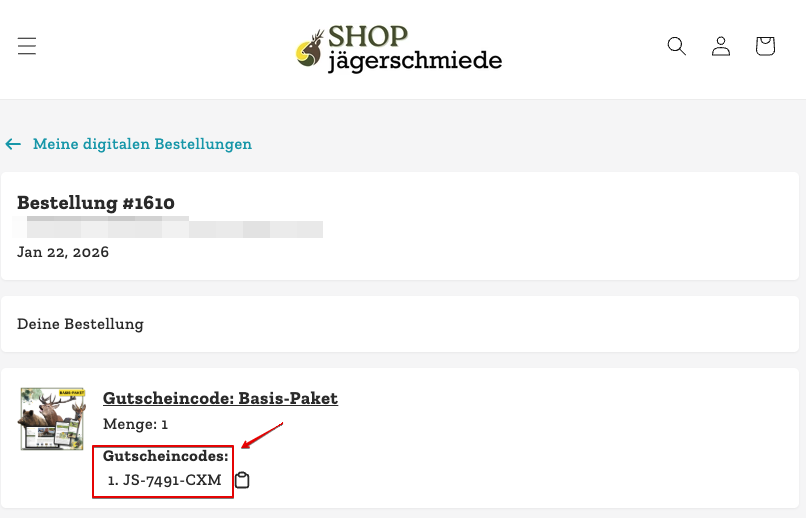 - Nach deiner Bestellung von Gutscheincodes für deine Jagdschüler erhältst du automatisch eine E-Mail. In dieser E-Mail findest du alle bestellten Gutscheincodes zum Weiterleiten an deine Jagdschüler.